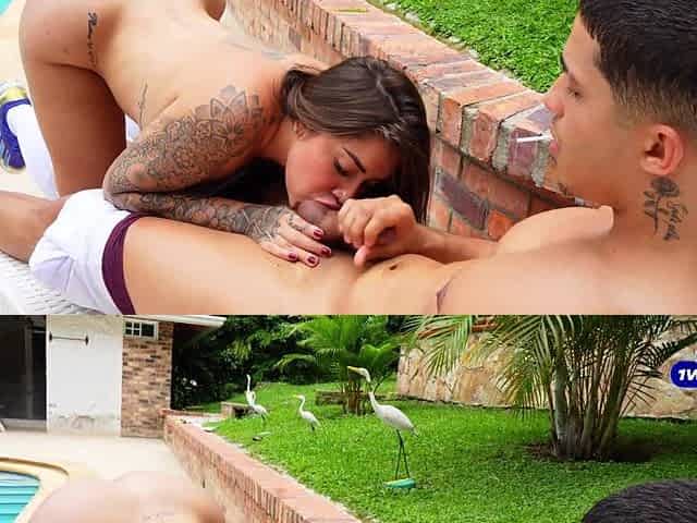 Lustful neighbour screws married stud whilst sunbathing by the pool - Sara Golden-haired