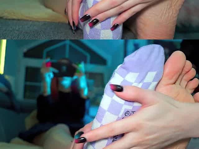 Licking her feet and toes like a pappy wearing latex mask