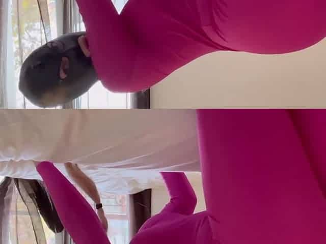 Full movie scene of showing off my large ramrod with collar and latex female hood
