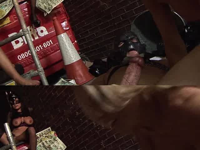 Kinky masked stud bangs a hot blonde in a dungeon