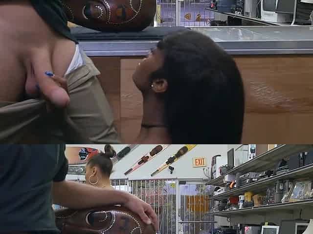 Smoking hot blonde in red is giving a deep blowjob to a masked robber and enjoying it