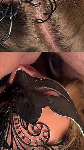 Sucking a schlong on my knees, wearing a mask with blonde hair, hose and high heels