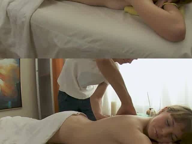 Blond masseuse with TOP TIER BODY rubs herself on hotty - Massage Rooms