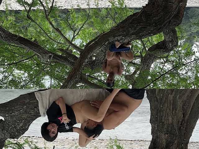 The Dwarf in the Tree Jerks off Like Crazy Until He Cums Watching the Sexy Couple Fuck on the Riverbank in the Open Air