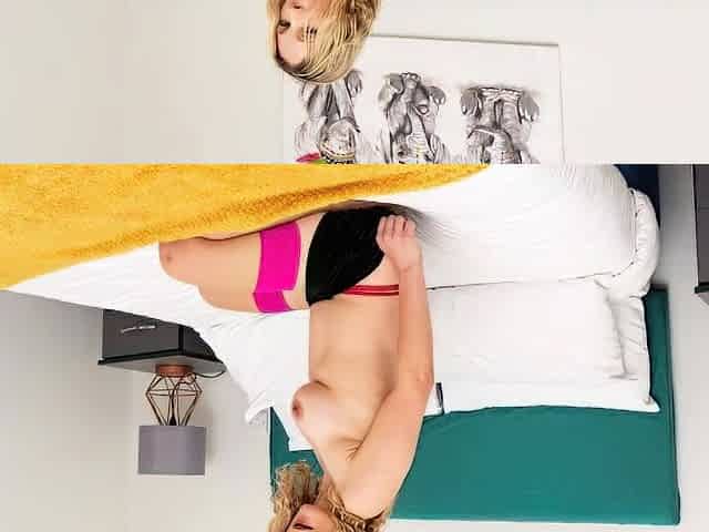 Shaved pussy blonde Tasha Reign with big boobs goes solo