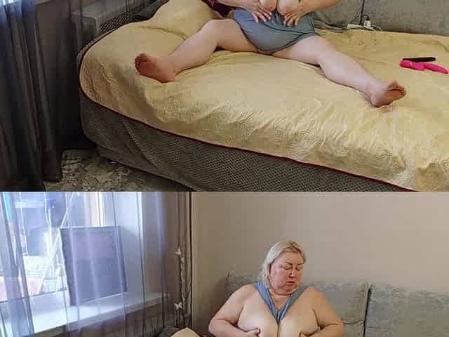 Blonde mature with big boobs masturbates in bed