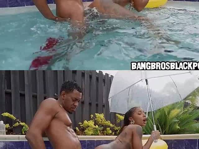 Ebony bombshell chick gets banged in the pool by an aged ebony dude