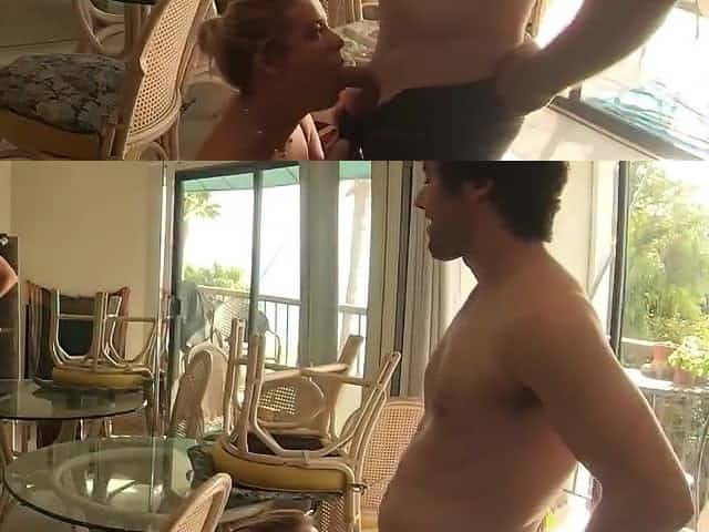 Blond mother I'd like to fuck sucking ebony ramrod POV behind Husband's back