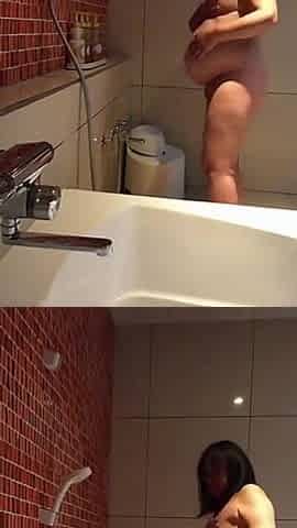 A gorgeous aged woman with large bazookas washes in the washroom and then very openly shows off all her assets.