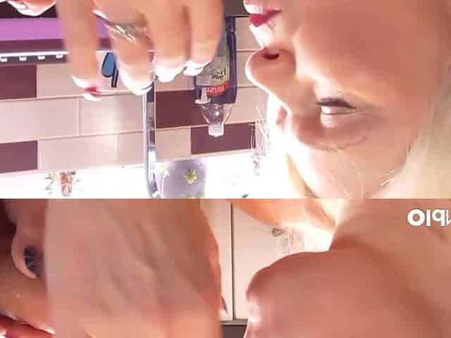 Awesome silicone tits blonde Summer Angel plays with her crack