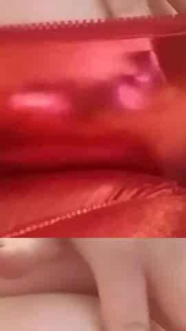 Cougar MILF in a hot red metallic catsuit with huge tits out for play