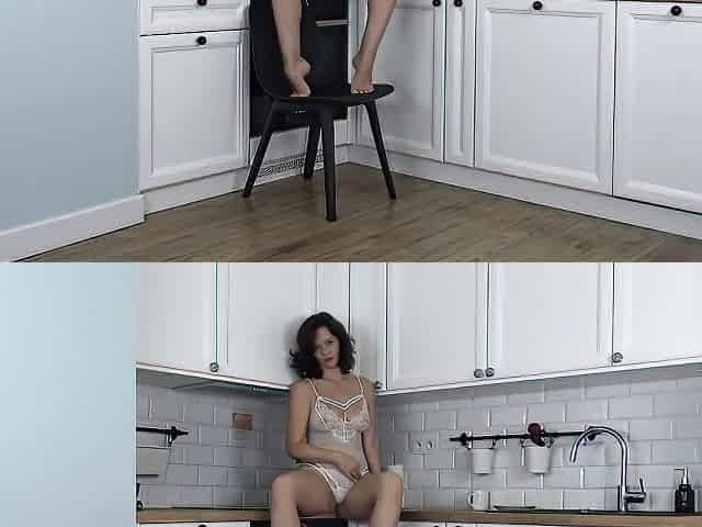 Big-boobed brunette mature Angel A masturbates in the kitchen