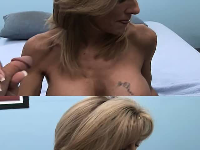 Amateur blonde MILF with big fake hooters takes on a pair of peckers