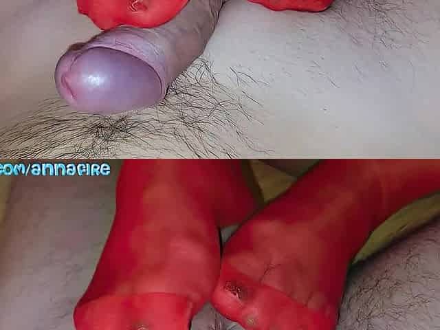 Nasty aged lady in red performs a marvelous footjob, sucks penis and much greater quantity ))