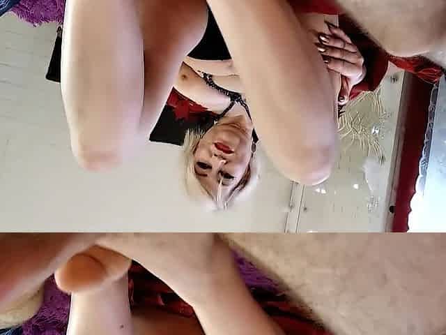 Older lady in red, footjob, tit screwing, ribald talk, tongue on love button & a large weenie in the throat!