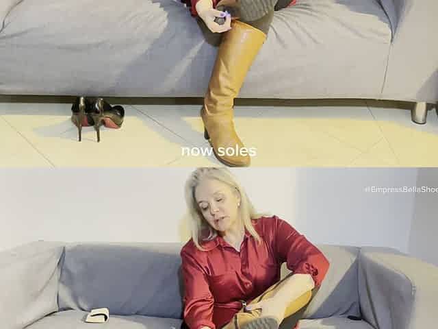 Mature cougar enjoys licking her long pussy lips while wearing high heels