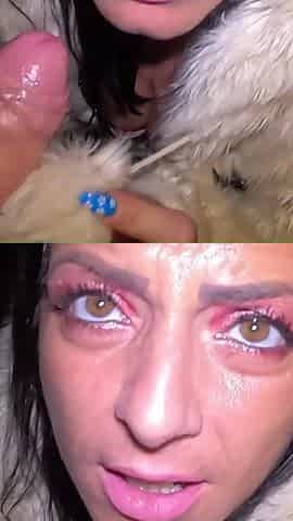 Risky Outdoor & Indoor Blowjob in Stockings & White Fur Coat Messy Cum Finish 297