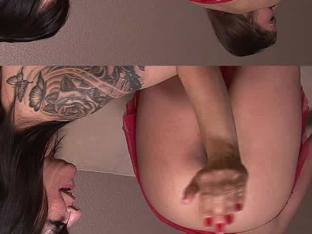 Old busted slut with gross implants fucked by dyke's vibrator in the bedroom