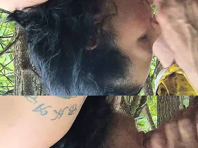 Sucking on a Straw in the Woods Squirting on Tree on Her Knees