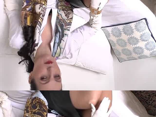Elegant brunette MILF Lady Victoria Valente in luxury attire with long white leather gloves for JOI