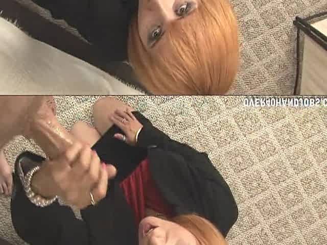 Redhead mature Sophia Mounds on her knees stroking a fat prick