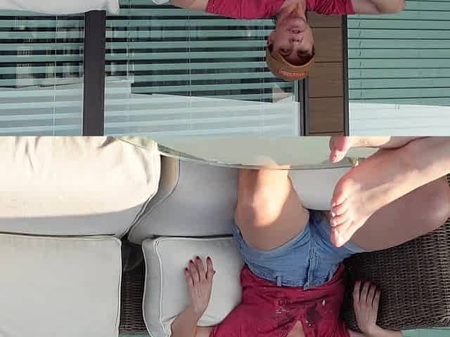 Antics and Grimaces of a Mature Redhead Bitch in Fishnet Stockings and a Solid Footjob