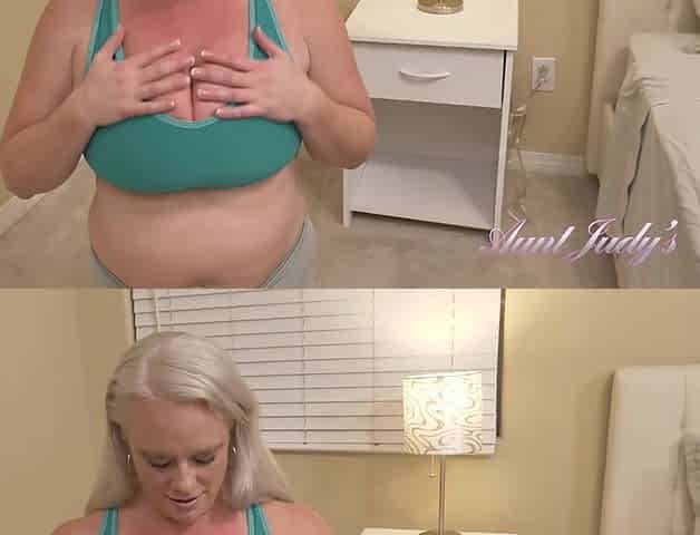 Blonde mature with big boobs masturbates in bed