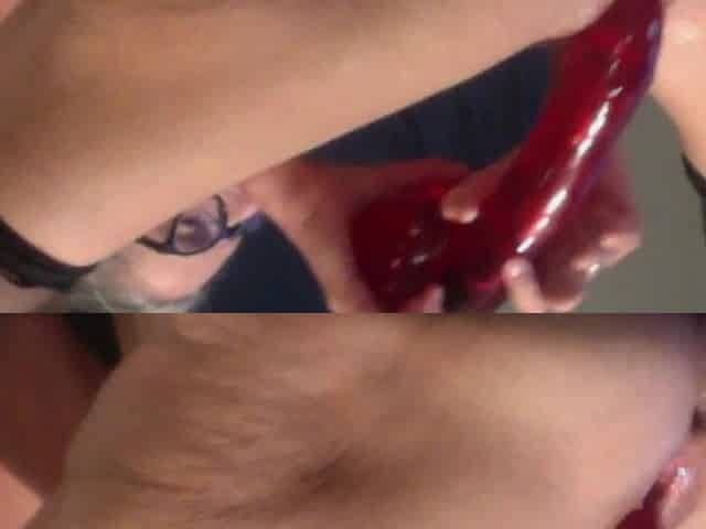 Beautiful brunette enjoys solo pleasure with glass toys.