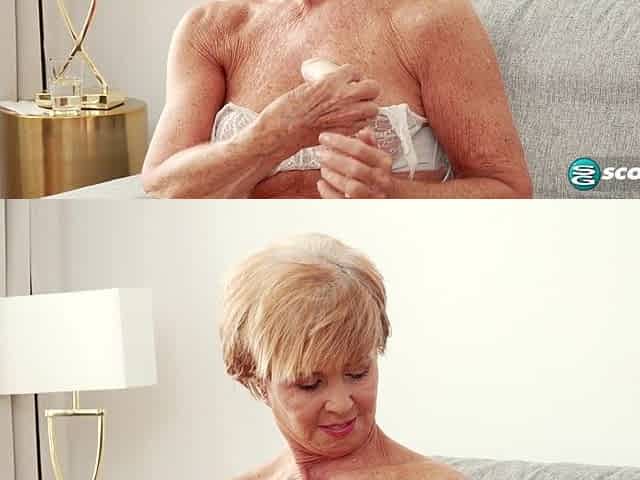 Mature with glasses plays with her cunt. Desirable blonde MILF with big tits does a great striptease show for the camera