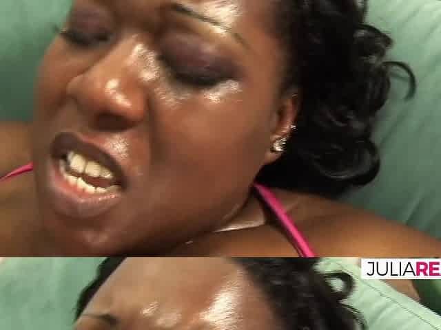 Ebony slut sucks a huge black cock then bends over for a hard fuck