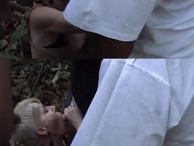 Busty mature slut spitroasted in a gangbang outdoors