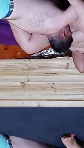 Freckled Bawdy Wife gets bent over the deck and screwed from behind butt plug