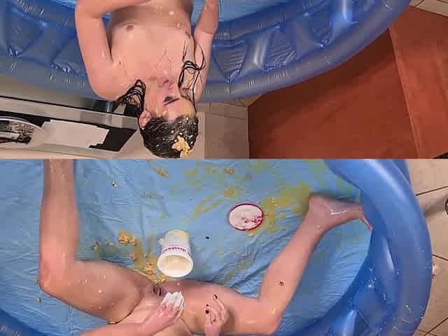 Chubby Titless Slut Having Messy Food Play Fun in a Inflatable Pool