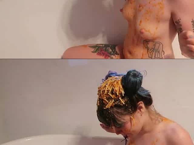 Brunette hair honey likes smearing food all over a breasty golden-haired sweetheart