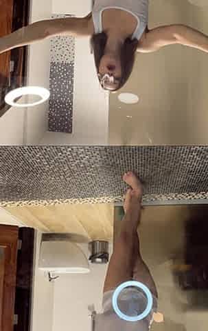 Desperate Midget Girl Undress Several Pantyhose Layers to Pee, Midget Pee in a Glass in Bedroom, Petite Brunette Opens Legs