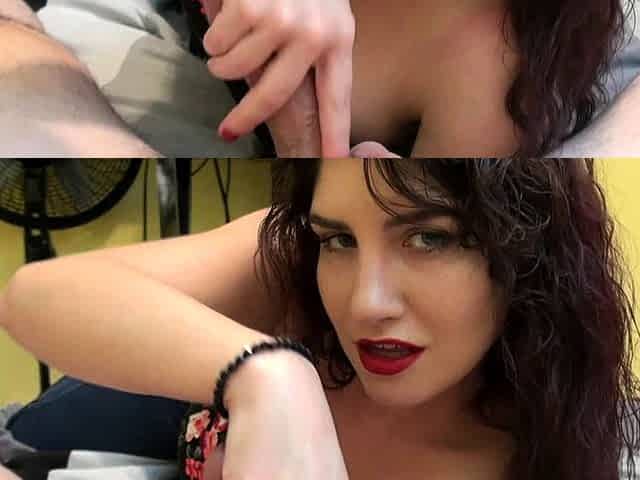 Big tit brunette sucks a big cock POV