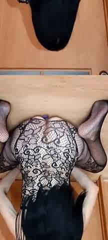 In fishnet nylons and pink Platform boots I suck a large penis until I cums on my wife's throat