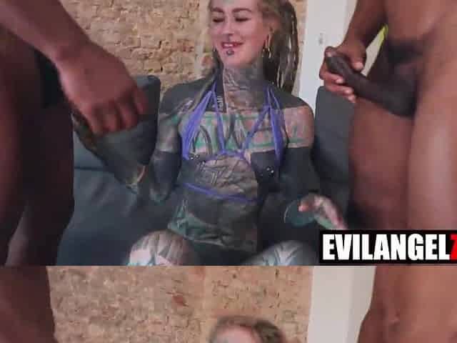 Breasty Tattooed Latin chick Enjoys Double Penetration and Thick Cumload