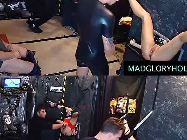 Female trio at the sex club being gangbanged