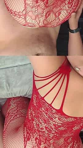 Huge Dildo Fucking and Sucking in Red Bodystocking