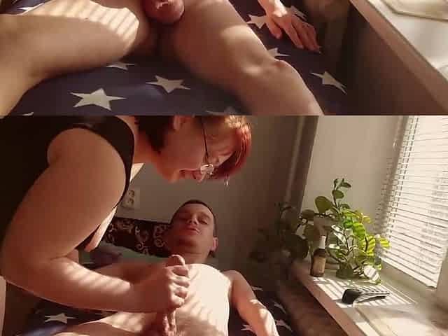 Mature lady plays with a young guy's massive cock