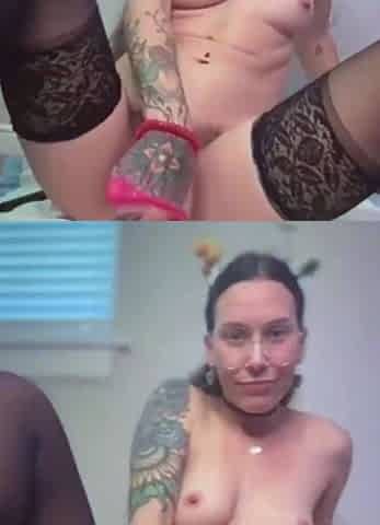 Tattooed honey wrecks her twat with a massive Bad Dragon