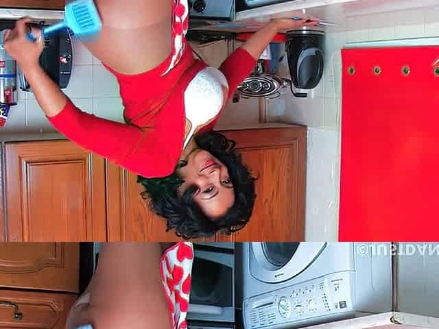 Busty housewife in lingerie cleaning home