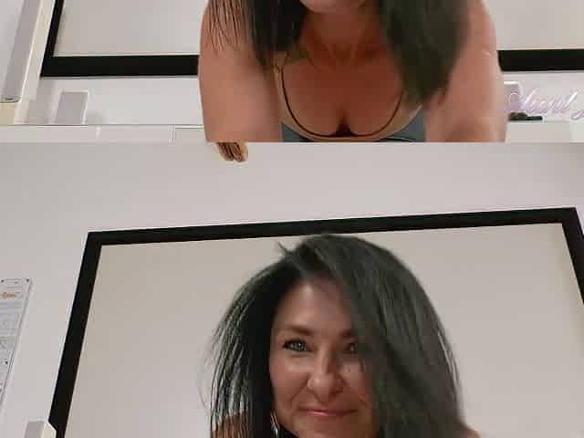Sexy as hell busty mature brunette Stefania opens her shaved pussy