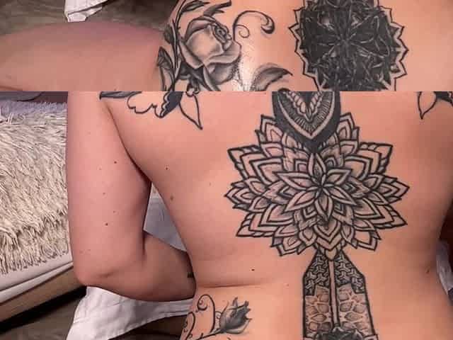 Beautiful woman with tattoos gets off while pleasuring herself with a toy.