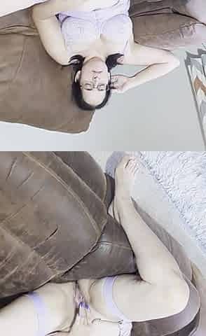 Horny brunette amateur milf solo pussy toying show on couch