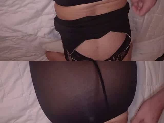 Beautiful brunette milf in garter belt and stockings gives great blowjob and fuck.