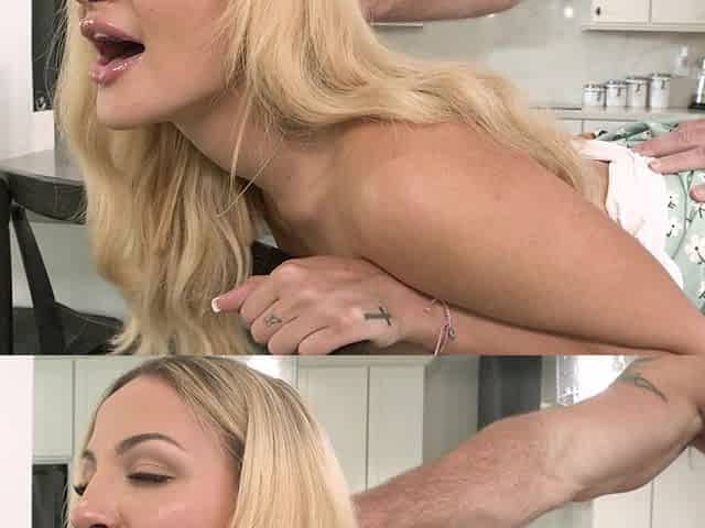 Fucking in the kitchen ends with messy facial for Marina Gold