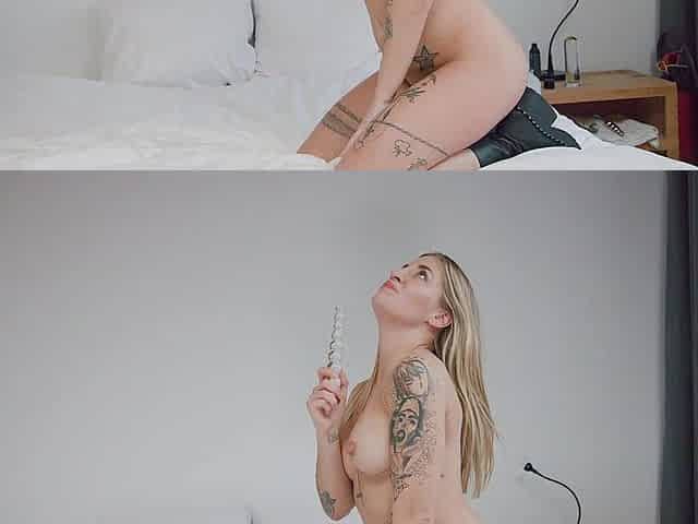 Blonde with meaty boobies hoists her legs up for a fake penis rail and then deepthroats a pecker - hottest XXX!