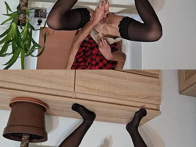 Perverted Teenager in a Mini Skirt Fucks Her Pussy with a Dildo on the Windowsill